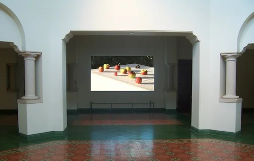 It seems only natural that Whitehouse's interest in creating artworks that expand the possibilities of marking time and recording transitions via the plein air experience would lead him to his most ground-breaking new body of work - Revolution - a series of state-of-the-art twenty four hour single shot HD videos that record every movement, every shift of light that occurs in the composition for an entire twenty four hour period - one revolution of the earth. The Revolution Series was conceived in December of 2002 as a means of recording the fleeting moments of an entire day through twenty four hour seamless digital 'paintings'. Compositions unfold before the viewer as incremental changes of light and sound. The Revolution works have precedent in the underground films of Andy Warhol, such as Empire which depicted the 'stillness' of the Empire State Building from day to night until film ran out of the camera. Debuting at the Tarble Arts Center is Whitehouse's Revolution: Bowl of Fruit a still-life inspired by Monet's Still Life with Apples and Grapes 1980 (Collection of the Art Institute of Chicago). As this work plays in the gallery the viewer sees barely perceptible changes in light and infinitesimal movement through a window. Whitehouse takes the fleeting quality of Impressionism that helped define the speed of modern life in the twentieth century and reveals it to be a fallacy. Look, he suggests, life moves at a much slower pace than we ever imagined.