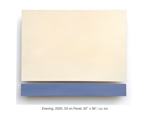 ”There has always been an edgy stillness in Whitehouse’s painting —calm lakes and skies often depicted without a clear time of day —that appeared to subliminally reference the nature of film making in which movement is created trough a series of still images strung together. He was masterful in his large canvases in creating the impression that something had happened two “frames” before, or was about to happen two “frames” ahead of the composition that was in front of the viewer. This exploitation of a moment has been honed in his new series Horizons in which he examines the dualities of movement and stasis through a series of minimal compositions of sky and water inspired by the Rothko rooms in the National Gallery in Washington, DC. All the works in the Horizons series are plein air canvases and panels that focus on the ever changing relationships of sky light and the reflective surface of the water beneath it that occur on the horizon of great lakes and oceans and Whitehouse paints them directly on site. Each Horizon is composed of two panels - the top of which accounts for a particular sky and the bottom which reflects the sky light mediated through the water below it at a particular moment. The panels are cradled so that while they are exhibited parallel to the wall they appear to float in front of the wall as pure natural light.”